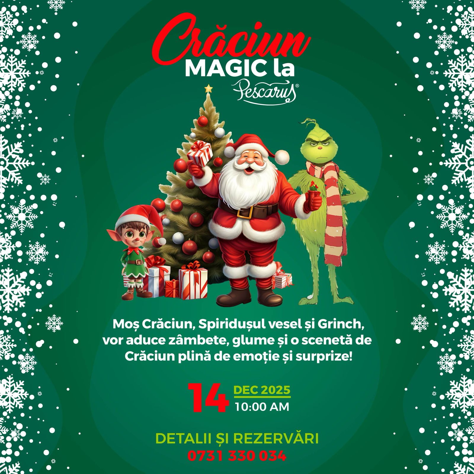 Duminică, 14 decembrie, de la ora 10:00, copiii sunt invitați la un spectacol plin de magie și voie bună, alături de Moș Crăciun, Spiridușul vesel și Grinch, care vor aduce zâmbete, glume și o scenetă de Crăciun plină de surprize. Cei mici se vor bucura de o scenetă interactivă, vor primi “Diploma de Copil Cuminte” și vor participa la colinde, dansuri, jocuri vesele, pictură pe față și baloane modelate.